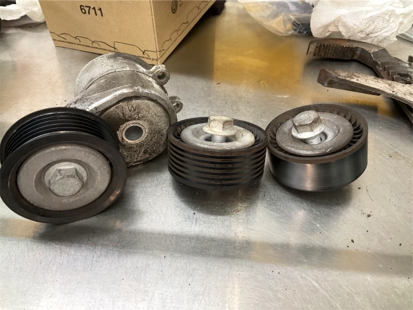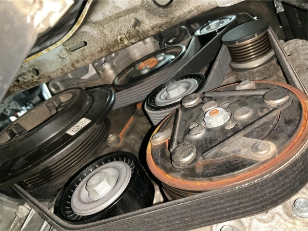 The drive belt and tensioner were replaced. This service is due every 8 years or 90,000 miles. The belt runs major components like the alternator and water pump, so replacing it on time prevents breakdowns.